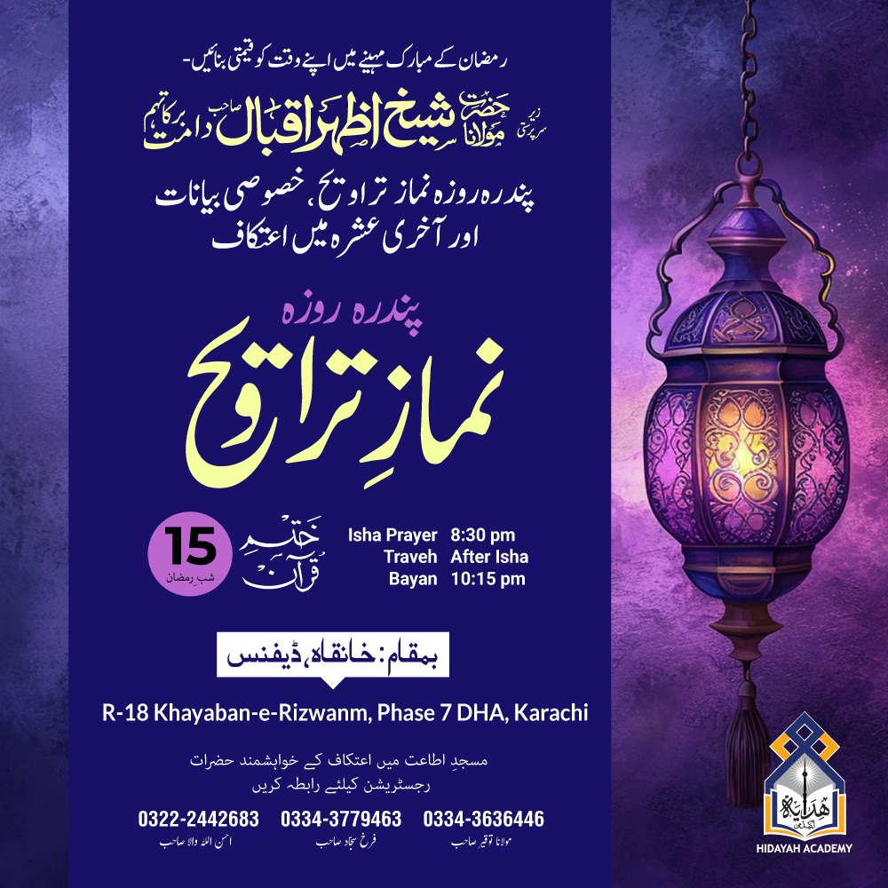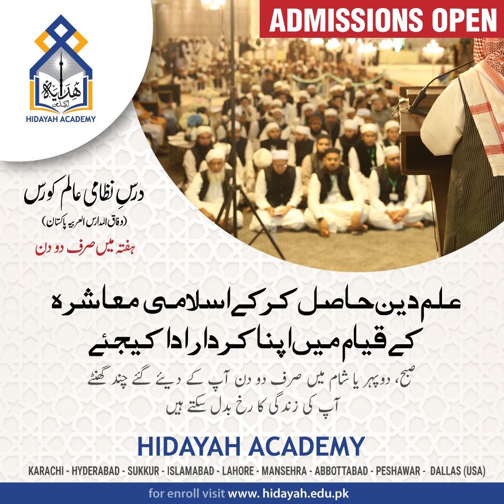 Hidayah Academy (Affiliation from Wifaq) is a professional and well disciplined institute of traditional Islamic learning for Dars-e-Nizami. It strikes a good balance between being progressive in its outlook whilst holding fast to traditional Islamic values. Special-care is taken to ensure good tarbiyah and nurturing of students. It incorporates their ideas and concerns with utmost flexibility to the furthest extent possible.